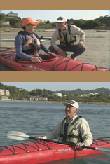 茂コさんは積極的に移住者の力になりたいと考えています。時には、半ば強引に友達になってしまうこともあります。シーカヤックのインストラクターをしている船原英照さんもその一人です。茂コさんは休日を利用し、船原さんの指導でシーカヤックにチャレンジしました。日常の生活では見られない海からの景色を楽しみ、初めてのシーカヤックを満喫することができました。