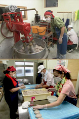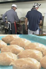 「浜市場」では、早朝からすり身天ぷらを作ります。小アジをミンチにするのは支配人の進さん、石臼での練りは社長の髙木さんが担当します。型作りはパートさんたちが加わり、最後の揚げは仲村さんと3人で行います。仲村さんはすり身作りの師匠、加茂紀代子さんの妹です。こうして約800枚のすり身天ぷらが出来ました。