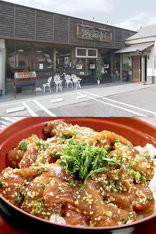 この日「浜市場」の調理場では、進さんと髙木さんが新しい天ぷらを作っていました。試作しているのは、マグロを使ったすり身天ぷらです。今まで何度か作ってみましたが、商品化には至りませんでした。今回は、改良を加えたマグロのすり身天ぷらと、それに山椒を混ぜた天ぷらの二種類を試作しました。