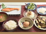 自宅に戻ると朝食です。亀田家の食卓には、オニオンスライス、ナスのしぎ焼き、具だくさんのみそ汁など自家製野菜を使った料理が並びます。畑仲間から分けてもらった生みたて卵は、ご飯にかけていただきます。手塩にかけた野菜中心の朝食を庭先で食べるのが、好次さんの楽しみです。
