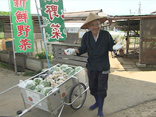 朝食の後、好次さんは引き売りに出掛けました。引き売りは不定期で行っています。採りたて野菜をリアカーに載せ、地下足袋にモンペ、ノラジュバン、すげ笠を身にまとい出発!毎回決まったコースを2時間かけて売り歩きます。次々と人々が好次さんの周りに集まってきました。畑へ戻るころには、リアカーいっぱいに積んでいた野菜は、ほとんど売れました。
