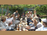 亀田さん夫婦の畑で、収穫を感謝するパーティーが開かれました。料理を持ち寄って、仲間達が集まってきました。とても仲が良い好次さんの兄弟も訪れ、畑中に笑い声が広がっていました。