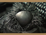 ハスの花托(かたく)を焼くことから始まった栄一さんの炭オブジェ作り。今ではトウモロコシやパイナップル、ミカン、イガグリ、紅葉、ラーメンなど、様々なものを炭にしています。形を保ったまま黒く光る炭のオブジェは、見ているだけで癒されます。