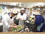 『千華』がオープンして半年。まだ慣れない作業も多く、普段は農園のスタッフとして活躍している地元のママさん方にも手伝ってもらっています。“包丁さばきが苦手なミワちゃん”こと向井美和さんと、“食いしん坊のミッチー”こと長澤三千代さん。チームワークも良く、和気あいあいと仕込みをしている3人ですが、予定より早くお客さんが来ると厨房は大慌て。本日も『千華』開店です!