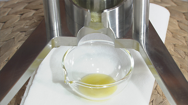 地域の資源として捉え直そうと「茶の実」を収穫している泰珠さん。収穫したお茶の実は自宅の庭で乾燥させ殻を剥きます。その実をミキサーで粉々にしてから専用の搾り機で搾りだすと茶の実油を採ることが出来ます。収穫したてのお茶の実100キロから、たったの1リットルしかとる事が出来ないとても貴重な油です。手動の搾り機では時間と手間が掛かるので、今は専門業者に実を送っています。いずれは、揖斐川町で茶の実油の加工所を作りたいと夢を膨らませています。