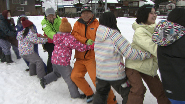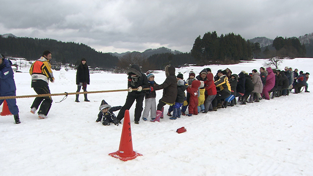 河面さんご夫婦が暮らす大毎集落の年に1度のイベント雪上運動会。冬でも集落を元気にしたいと24年前に始まりました。子供からお年寄りまで集落のほとんどの人が参加します。定番のリレーや綱引き、更に雪国ならではの長靴飛ばしやソリ競争など、皆さんの歓声と笑い声が絶えない1日でした。