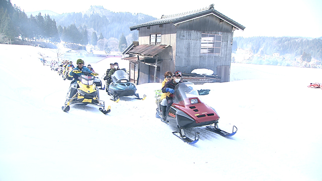 今年で4回目の開催となるイベント「雪山メープルシロップ物語」。公募で集まった参加者はスノーモービルに相乗りして早春の雪山に入り樹液採取の体験をします。「大毎集落とメープルシロップに興味を持ってもらいたい」と専一さんは張り切っていました。参加者の反応も上々、来年も開催予定です。