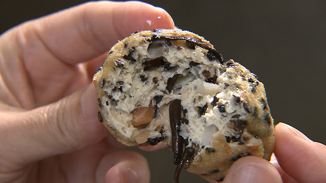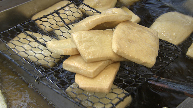 ご夫婦のお店では、豆腐以外にも油揚げやがんも等の揚物も販売しています。「もめん豆腐」とは違う製法で作られる「油揚げ」は、仕込みから完成まで1日がかりです。人気の「白ほたるがんも」には黒ゴマやひじき、野菜がたっぷり入っていて、菜種油で揚げると何ともいえない香ばしさ!常連のお客さんは予約をして買うほど人気の商品です。
