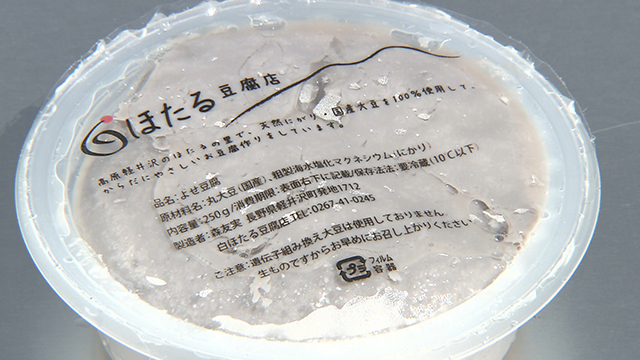 森さんご夫婦が作る、素材にこだわった豆腐店。もめん豆腐は1日限定30丁です。その他にも「油揚げ」や、黒ゴマやひじきなどがたっぷり入った「白ほたるがんも」などを販売しています。自慢の「よせ豆腐」のほか、軽井沢ブランドに認定された「黒大豆寄せ豆腐」も人気です。