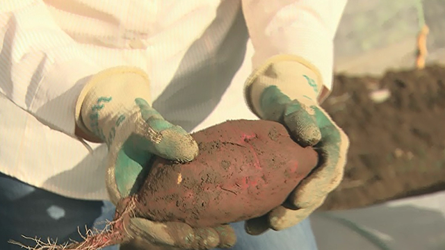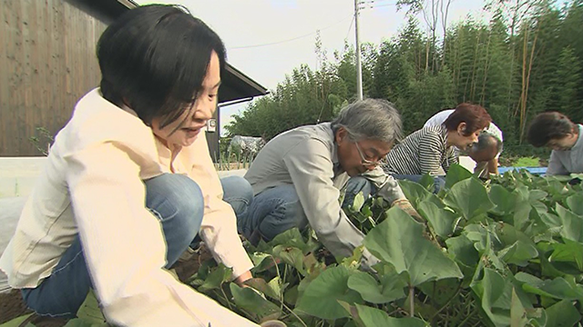 地元の農家から借りた畑で、仲間と共同で野菜作りをしている紺清さん夫婦。この春に初めて植えたサツマイモを収穫します。色鮮やかで、立派に育ったサツマイモは「ろくぶんぎ」で出すパンの材料になります。