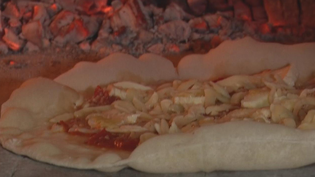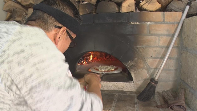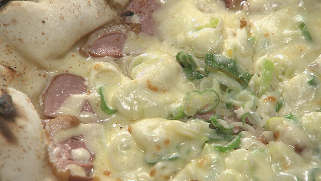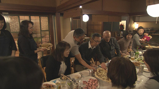 3人は季節限定ピザの新しいアイデアを模索していました。この日は、お客さんの率直な意見も聞きたいと20年来の仲間達を招いて試食会です。新作の「合鴨と長ネギのピザ」を食べたみなさんの感想は「美味しい」「お酒に合う」と好評。素直な意見を言ってくれる信頼できる仲間たちの言葉に一安心。それと同時に感謝でいっぱいの樋口さんご夫婦です。