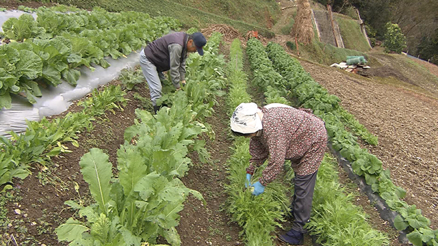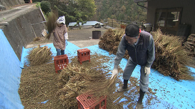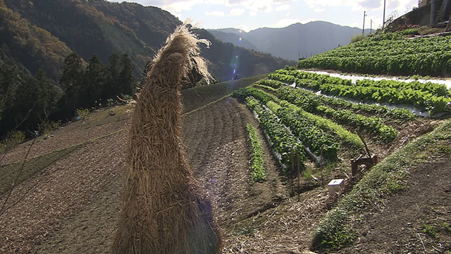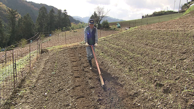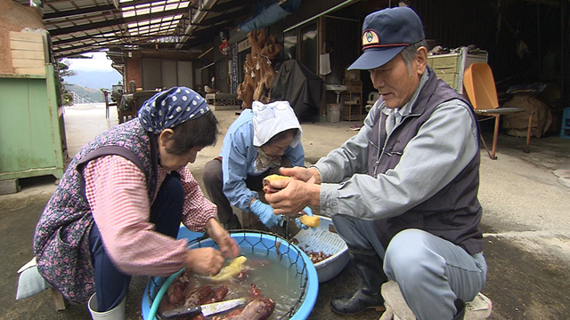 農業に加え、干しいもや漬物など昔ながらの保存食作りも木下家には欠かせない恒例行事。正雄さんのお母さん、90歳のヤエ子さんは、50年以上、漬物を作り続けている山暮らしの生き字引です。傾斜地農法も、イノシシ狩も、この山でしか体験できないものばかり。先人から大切に継承されてきたワザが、民宿の宿泊客を楽しませてくれます。
