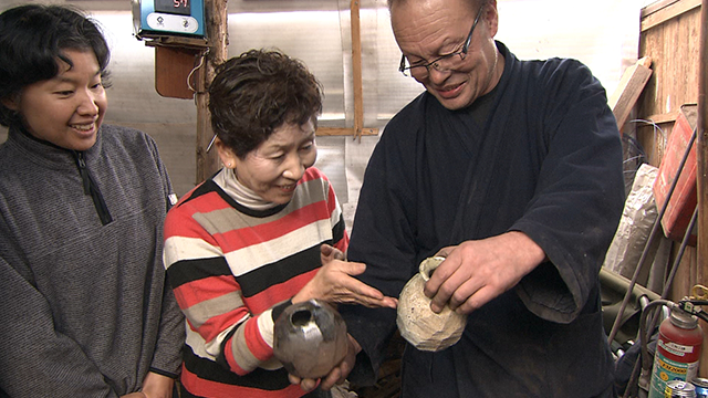 廣行さんの陶芸は、釉薬(ゆうやく)の代わりに食塩を使う「塩釉(えんゆう)焼き」と呼ばれるドイツで生まれた技法です。塩は熱くなった窯の中に直接撒いたり、作品に直接塗ったりと、やりかたは色々ありますが、窯が高温になることで塩の蒸気が発生し、作品の表面がガラス状の被膜で覆われることから液体に強く、ドイツではビールジョッキなどが多く作られました。日本には1950年代に伝わったと言われています。
