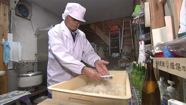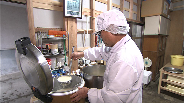 この日、どぶろく造りで大切な麹づくりを行いました。良い麹が出来ないと、良いお酒は出来ないという良夫さん。蒸した酒米に種麹をかけて丁寧に混ぜていきます。混ぜ込んだ後、温度管理をしながら麹菌が酒米に根付いていくのをじっくり待ちます。2日後、きれいな麹ができました。良夫さんもひと安心のようです。