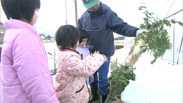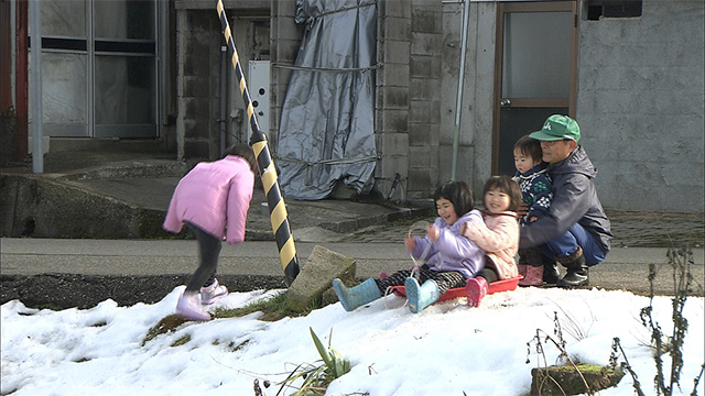 良夫さんの本業は農業です。畑には冬でも、数種類の野菜が育っています。この日は、お孫さんたちと一緒に収穫へやってきました。石川県特産の能登むすめや、ネギにダイコンを、手伝って貰いながら収穫。この自家製の野菜が、農家レストランでお客様に振舞われます。お孫さんたちは野菜を収穫した後、畑の傍でソリ遊びに大はしゃぎ。かわいい声に包まれ、良夫さんと幸子さんは賑やかな生活を送っています。