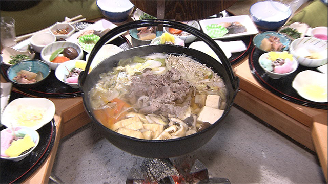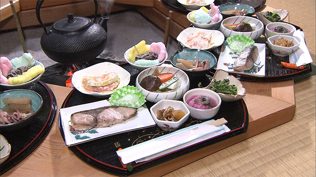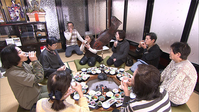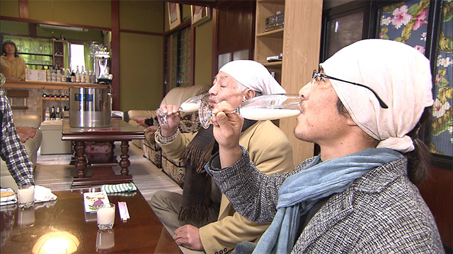 農家レストラン「太郎右衛門」に予約のお客様がやってきました。囲炉裏を囲んで、幸子さんが作った「かぶら寿し」や「いのしし鍋」を楽しみます。もちろん、良夫さん自慢のどぶろくや甘酒も振舞います。どぶろくは飲み放題なので、食事は大盛り上がり。最後は良夫さんも加わって、一緒にどぶろくを楽しみました。