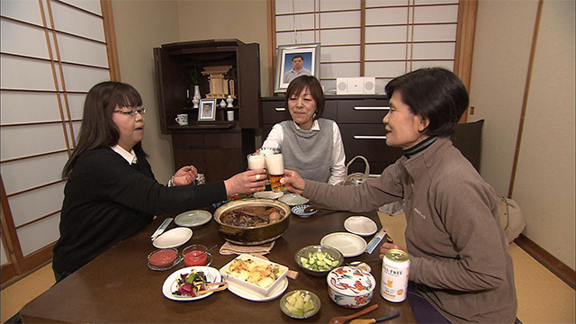 この日は自宅で女子会。近所のお友達、久美子さん、敦子さんが美加さんのお家を訪れました。静岡おでんや特製サラダなど、美加さんお手製の料理が沢山並びます。料理好きな美加さんは、たまにこうして腕を振るうために友人を招待するんです。美味しい料理を食べながら、気の置けない友人と楽しいひと時。お腹も心も満たされた様子の美加さんでした。