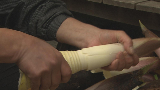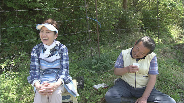 お店の定休日。小川家の10代目として、農業も本格的にやりたいと考えているご夫婦にとっては大切な日です。この日は、普段手入れしている畑ではなく、自宅の裏山に旬を探しに出掛けました。土から顔を出していたのはタケノコです!沢山掘ってその場で皮を剥いていくお二人。子どもの頃からよくやっていたと言う賢治さんにとってはお手の物、富子さんは少し手こずっている様子。お二人は、それぞれの得意分野を生かしてお互いを支えあっているんですね!