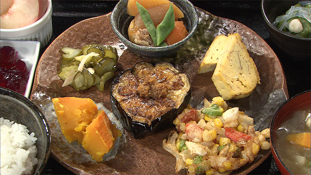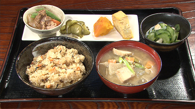 午前11時、「小昼処 和来亭」開店です。和子さん自慢の家庭料理が並ぶ日替わりの『和来膳』。この日のメニューは、夏野菜のかき揚げ、米ナスの揚げ浸し、肉じゃが、キュウリの古漬けなど、おふくろの味がたくさん。『小昼膳』はおやつ感覚で召し上がって欲しいと、おかずを減らし、ご飯の代わりに人気の「おこわ」を添えています。お客さんは、「お母さんの味、ホッとする」と和んでいました。