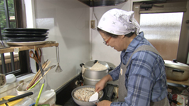 朝5時から和子さんは、「和来亭」へ。直売所へ出すお弁当作りです。まずは「おこわ」。もち米を炒め、具材の入った汁を吸わせます。味が染み込み、短時間で出来る知恵です。和子さんの「おこわ」、評判がとても良いんです。直売所には毎日10パック以上のお弁当を出します。納品にやってきた仲間たちと会話が弾む和子さん。楽しそうです!