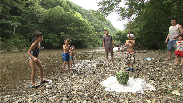 この日、阿武隈川の上流で、長男と次男の家族が集まりました。お孫さんは全部で5人。川遊びやスイカ割りをお孫さんたちと一緒に楽しむ渡邊さんご夫婦。「孫と遊んでいると、日頃の疲れが吹っ飛ぶ」と、かわいいお孫さんたちに囲まれて幸せそうなお二人です。