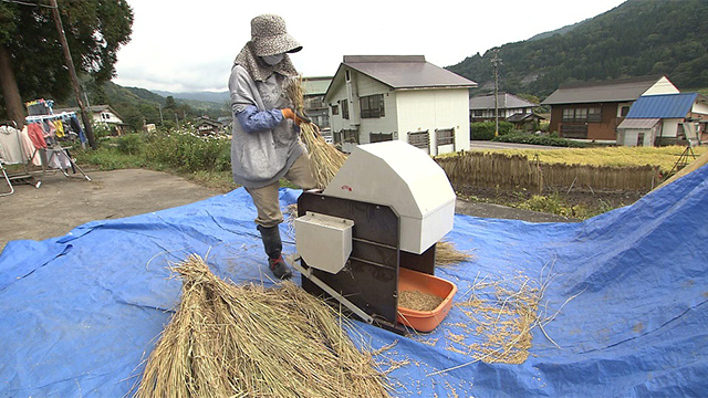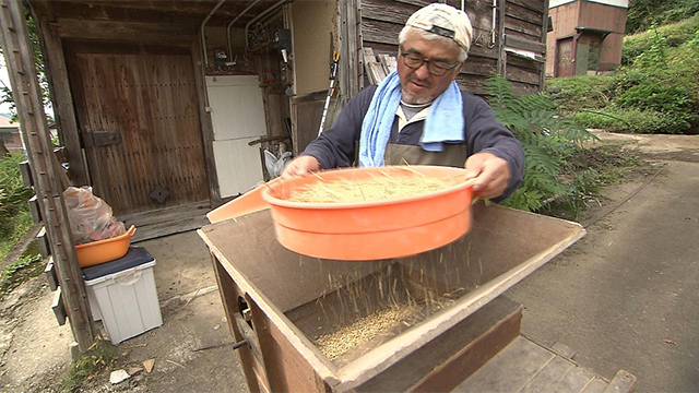 手作業で米作りをしている藤田さんご夫婦。手刈りで収穫し、稲をハゼにかけて、自然に乾燥させていきます。その後、理世さんが足踏み脱穀機で稲から籾を外し、温彦さんが唐箕(とうみ)を使って籾と藁クズを分けます。天気が良くないとできないので、自然に左右されてしまいますが、それもまた楽しいと秋の収穫を満喫しているご夫婦です。