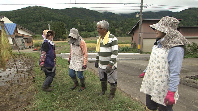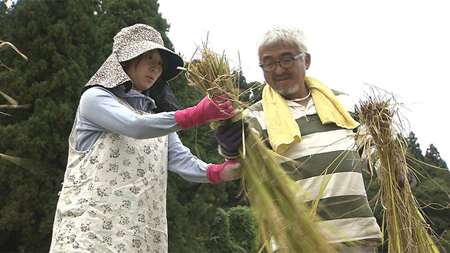 移住前から週末に通っていたご夫婦は、地元農家の進めで稲作を始め、自分たちで手作りした米の美味しさに感動したことから、手作業での米作りに取り組むようになりました。今年も実りの季節を迎え、藤田さんご夫婦は稲刈りを始めます。すべてを手で刈って収穫するためにとても時間がかかります。そんなお二人を地域の先輩方などが助言し手伝ってくれています。