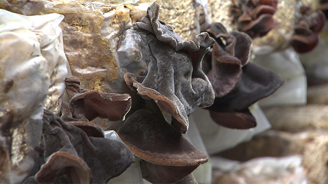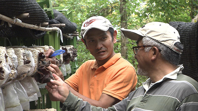 近所に暮らす移住仲間の金子さんを訪ねた温彦さん。金子さんは2000個の菌床をそろえ、今年からキクラゲ栽培を始めています。手間は掛かりますが、高齢者でも出来る作業なので、地域の皆で栽培して集落の名産になればと期待しています。まだまだ始まったばかりのキクラゲ栽培ですが、集落全体で暖かく見守っています。