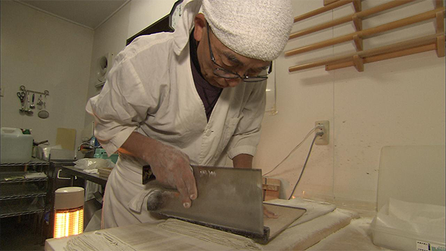 営業日の玄吉さんは深夜2時から蕎麦を打ち始めます。蕎麦打ちにおよそ3時間。その後、天ぷらの具材準備に1時間。仕込み終了は朝の6時過ぎです。喜代子さんは朝9時に厨房に入り、そばつゆや小鉢の準備。喜代子さんは家事もあるので、開店前の作業は少なめにしています。この作業分担、玄吉さんの優しさなんです。