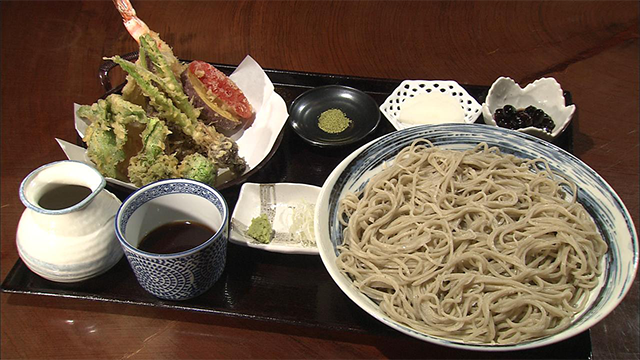 玄吉さんの手打ち蕎麦は、北海道産蕎麦粉を使った二八蕎麦と地粉を使った田舎蕎麦の2種類があります。一番人気のメニューは天ぷらざる。エビ、ニンジン、ヤーコン、パプリカ、柿など彩り豊かな10種類の天ぷら。どれもサクサクの食感で蕎麦との相性は抜群です。その他、岩魚天ぷらざる、鴨南蛮そばも人気です。