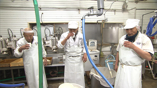 若木屋には、修輔さんの他に豆腐職人が2人います。絹ごし豆腐を担当する67歳の下平武二さんと、豆腐作り60年以上という大ベテラン、井出健二さんです。また、揚げもの担当の峰松みさ子さんも、先代の頃から働いてくれています。より美味しい豆腐作りを目指し、皆さんで日々精進しています。