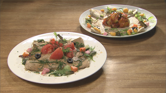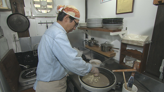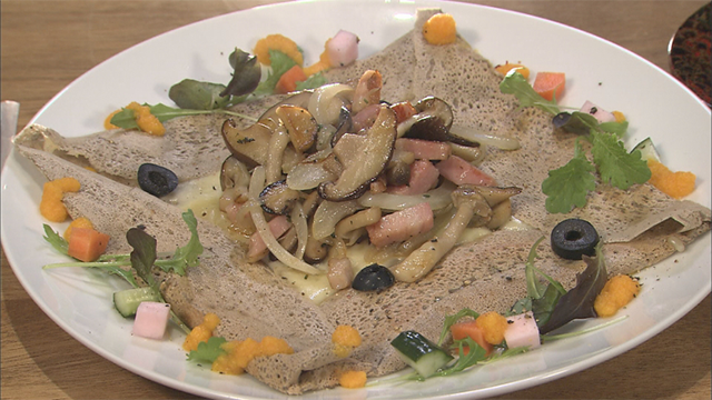 店の看板メニューはガレット。生地に使うソバ粉は飯島町で生産されたものです。それに塩と水だけを使い、ソバ粉の香りを引き立たせます。生地はフライパンではなくホットプレートで焼き上げます。油を引かなくても焦げ付かず、ヘルシーなガレットに仕上がるそうです。盛り付けはむつ子さんが担当。生地のもちもちとした食感と鮮やかな盛り付けがお客様に好評です。