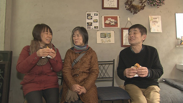 朝の9時、喫茶店で出す和菓子の買い出しへ。由美さんのお菓子の原点である最中を購入します。午前10時、喫茶「万作-第二楽章-」オープン。夫の忠幸さんも週に2日ほど、喫茶店を手伝ってくれています。お客さんも景色を楽しみながら、ゆっくりとくつろいでいます。