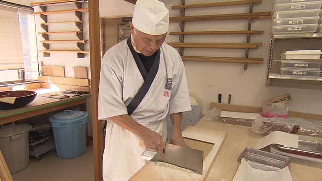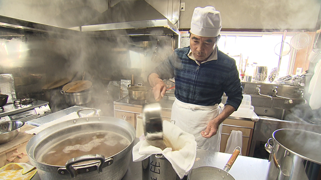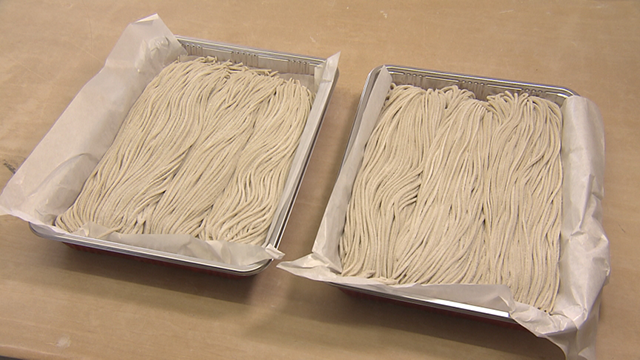 定休日、大澤さんは出汁作りです。昆布とイワシ、サバ、2種類のカツオで出汁を取ります。「うどんも蕎麦も出汁が命、日々研究している」と大澤さん。一方、西さんは定休日でも蕎麦を打っています。場所は蕎麦愛好家が集まる蕎麦道場。お店では「二八蕎麦」を打ちますが、ここでは蕎麦粉14、つなぎ1の「一四一(いちよんいち)蕎麦」を打ちます。つなぎが少ない分、打つのも難しい。奥深い蕎麦道です。