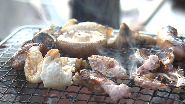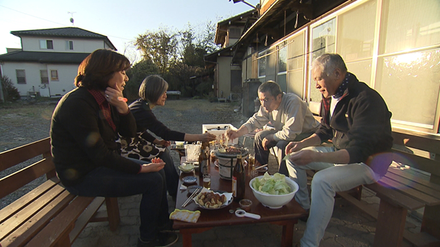 庭でバーベキューです。七輪の上には秩父名物・ホルモン焼き!大澤さんの奥様・明子さんと西さんの奥様・明恵さんも一緒です。焼き奉行は大澤保夫さん。焼き頃、食べ頃を見計らってパクリ!そしてビールをゴクリ!夕日を浴びながら最高です!!「また4人で集まりたいね!」と笑顔の明子さん、明恵さんでした。