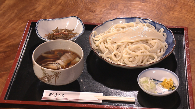 大きな打ち台で2人向かい合ってうどんと蕎麦を打ちます。大澤さんのうどんは、讃岐うどんのようなコシの強さが自慢。手打ちの証拠“耳”の部分をサービスで全食に付けています。西さんの蕎麦は二八。喉越しがよく蕎麦の香りが引き立ちます。看板メニューは「肉汁うどん」と「肉汁そば」。お昼にはサラリーマンなどが多く来店する中、2人の様子を見に同級生が来ることもしばしば。学生時代の思い出話しに花が咲きます。