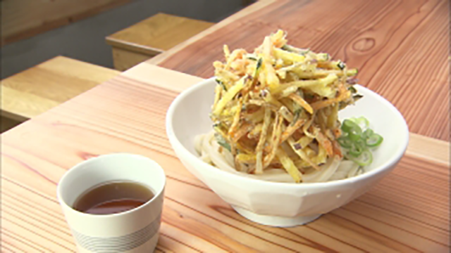 オープン前日。お店のカウンターで出来上がりを待っているのは、妻の悦子さんです。作るのはイチオシメニューのかき揚げうどん。カボチャ、ニンジン、サツマイモなどで作ったボリューム満点のかき揚げがのっています。