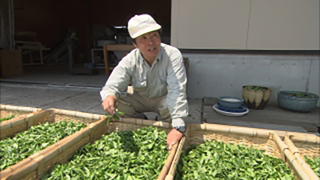 正治さんのお茶作りでは、刈り取った茶葉を日に当て、発酵を促します。これは萎凋(いちょう)という一手間。通常日本茶は、茶摘みのあとすぐに加熱して発酵を防ぐのですが、正治さんは花のような香りを出す為にあえて微発酵させます。