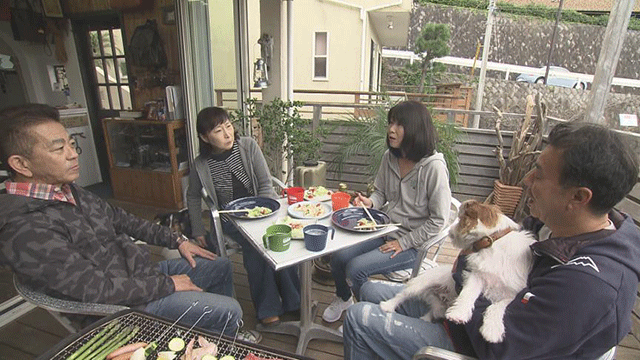 この日は、お隣の吉瀬さんご夫婦とテラスでバーベキュー。月に何度も行き来する、気の合うお隣さんです。趣味や暮らしぶりも似ているそうで、キャンプ用品も吉瀬さんのリクエストで作りました。愛犬のビッケ君の首輪も一成さんが作ったオリジナルです。そして夕方になると、近くの七里ヶ浜に愛犬リナと散歩です。ご近所には犬好きがたくさん住んでいて、粉川さんご夫婦もサニーとフリーを連れて散歩中。海辺はワンコの社交場です。