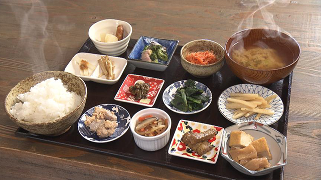 『夢や』の営業は土曜日曜の週2日。かつ子さんも手が空いているときには、厨房を手伝ってくれています。自慢は手作りのランチ。かつ子さんが作る米糀(こうじ)が『夢や』の味の決め手です。糀(こうじ)に醤油を加えて一週間寝かせる、「醤油糀」や「塩糀」、「甘糀」など糀の調味料を作っています。“ヘルシーで美味しい”とお客様からも大好評です。