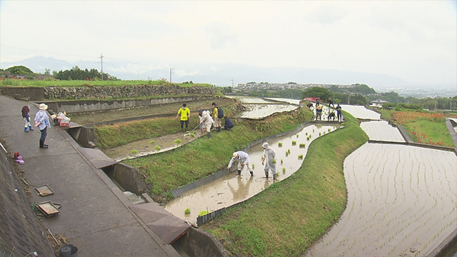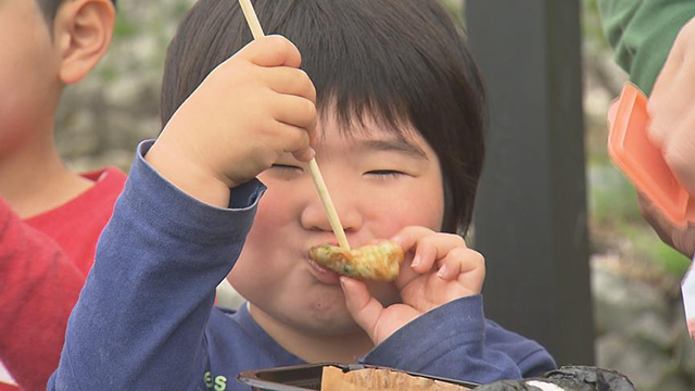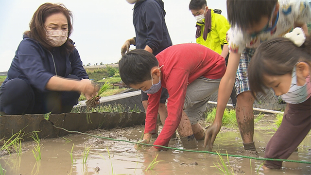 あいにくの空模様ですが、この日は長女・彩子さん一家と里美さんの元同僚が手伝い、棚田で田植えです。クラインガルテンからも、昇さんが世話人となっている濱田さんと秋山さんが応援に。もちろん金丸さんも助っ人です。田んぼに足を取られ大人も子供も大苦戦、孫の晴登くんは2年目なので上手に苗を植えています。田植えの後はお待ちかねの弁当タイム。葉太くんもこの笑顔!皆さん、棚田が黄金色に染まる秋に、またお会いしましょう!