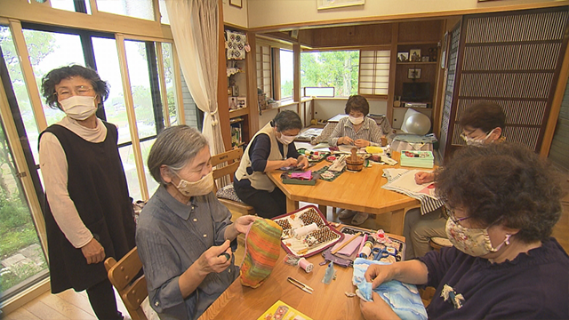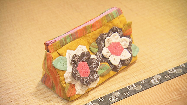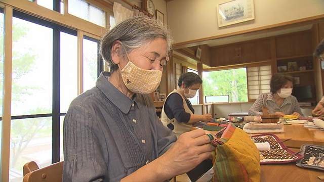 この日、里美さんはご近所のお宅へ。パッチワークのサークルに参加です。もともと洋裁が趣味だった里美さんは、畑の師匠でもある金丸たえ子さんに誘われ通うようになりました。里美さんは今、お花のポーチを制作中。皆さんも農作業の合間に参加し、思い思いのデザインから世界で一つだけの作品を作ります。里美さんのポーチも大輪の花が咲いています!