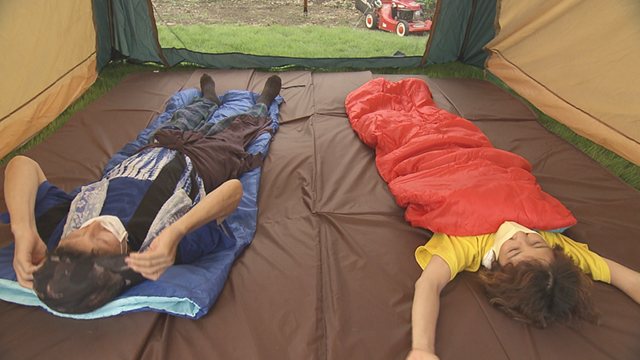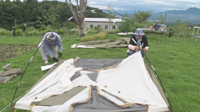 実はお2人…建築の仕事でキャンプ場設計に携わったことはあってもキャンプは未経験。そこで、オープン前にお客さんの気持ちになってキャンプの実証実験をしてみることに。慣れないテントの設営に苦戦しましたが、30分かけて無事に完了。炭を起こし始めると「ランタンがない!」と気づき、バーベキューをしていると途中から大粒の雨が!夫婦で大慌てしながらも、なんとか炭火焼きやカレーをこしらえ、ようやくテントで夕食です。実証実験をしてみたことで、ランタンや雨対策の道具など、貸し出し用に揃えるべき備品が沢山あると気づいたご夫婦。オープンまでに対策を練ることが出来ました。