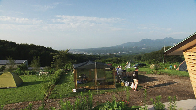 快晴の天候のもと美しくそびえる榛名山の絶景を満喫しつつ、一夜を過ごしたお客さんたち。「他では味わえない、とても気持ちがよかった」と大好評!