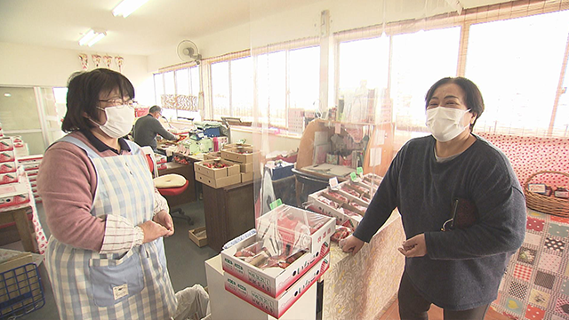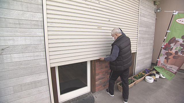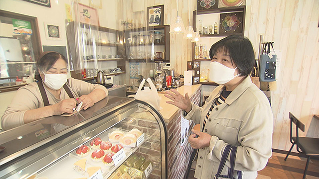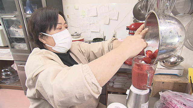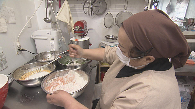 営業日の朝。章伸さんが店のシャッターを開け、のぼりを立て、花に水をあげるなど開店準備を手伝います。忍さんはケーキ作り。タルトやロールケーキなど生クリームを使うものは営業日の朝に作ります。出来たてのイチゴロールとヨモギシフォンケーキを購入した常連さんは「忍さんの人柄のように、どのケーキも優しい味で美味しい!」と笑顔でした。このお客様の笑顔が、忍さんの元気の源なんです!