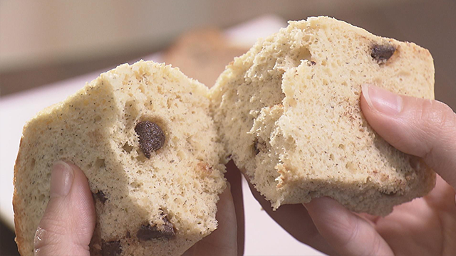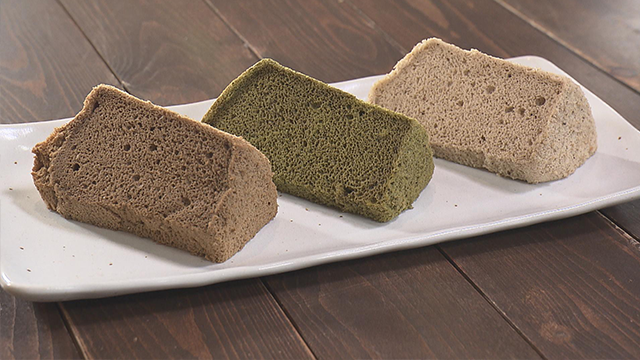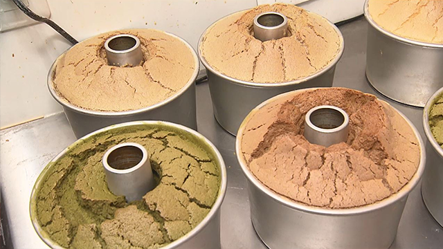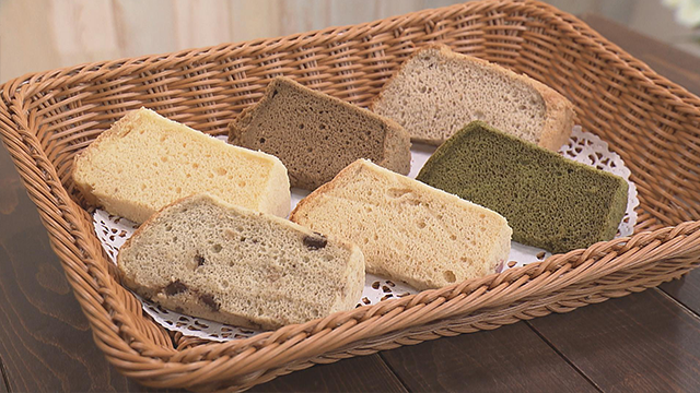 忍さんが作るのは、合成着色料や添加物を使わないシフォンケーキが中心。定番メニューはバニラ、コーヒー、抹茶、紅茶の4種類。その他にイチゴやバナナを練り込んだ果物シリーズ、桜の塩漬け、ヨモギなど季節限定シフォンケーキもあります。どれもいい香りで食感はしっとりふわふわ!食べるとみんな笑顔になります!