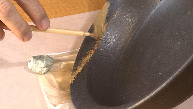 金継ぎの依頼品の中には、ちょっと変わったモノもあります。この日修復していたのは、なんと招き猫!のり子さんが東京で暮らしていたときに通っていた飲み屋さんの招き猫で、欠けた右足と左耳の修復を頼まれたのです。耳に金粉を蒔き磨くと、招き猫が少し微笑んでいるように見えました!「店に帰って、また沢山のお客さんを見守るんだよ」と、のり子さんとトムさんも笑顔でした。