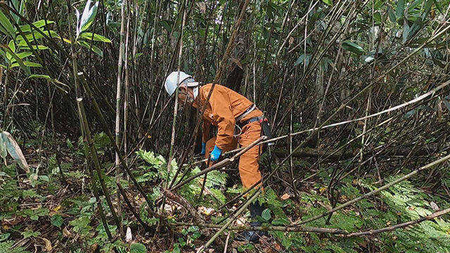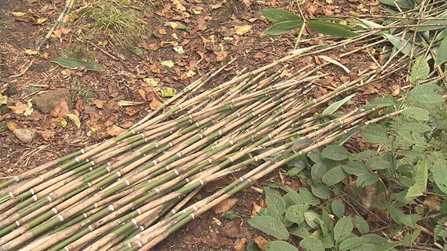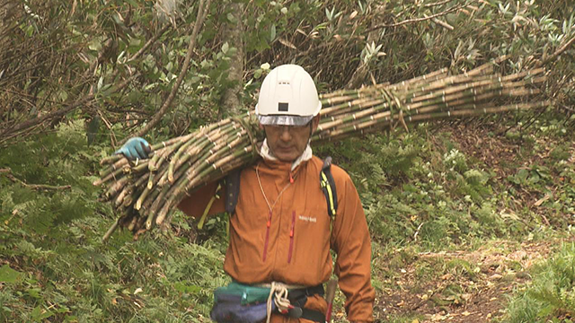 利文さんはこの日、材料の「ネマガリダケ」を調達します。戸隠竹細工の職人しか入れない黒姫山の中腹まで、歩いて約40分の山道を登ります。「ネマガリダケ」の群生地に到着すると手早くナタで採取。戸隠竹細工は、編む部分によって使う竹の年数が異なります。この日は1年目の若い竹を、自分が使う分だけ採り下山しました。