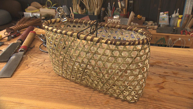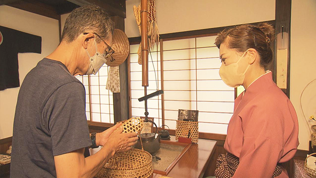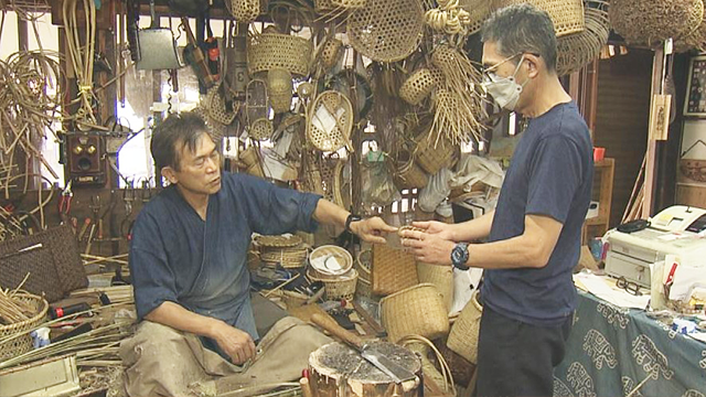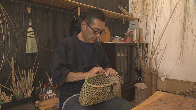 旅館の女将さんからの依頼で作った、「湯かご」の様子を見に来た利文さん。湯かごの取っ手と、経年により縁が広がってしまった「おしぼりかご」の修理を頼まれました。利文さんが向かったのは、師と仰ぐ井上栄一さんの工房です。父から学べなかった縁の修理方法を相談すると、惜しげもなく技を見せ説明してくれる井上さん。利文さん、しっかり技を学んで、職人としてどんどん成長していましょう!