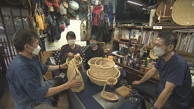 師匠・井上さんの工房に戸隠竹細工の若い組合員が集まりました。よく集まってはこうして勉強会をしています。この日は、自分たちの作品を持ち寄り、アイデアや意見を交換します。しなやかなで強い「ネマガリダケ」を使った伝統ある竹細工。利文さんは、ふるさとの宝「戸隠竹細工」を改めて伝承したいと心に刻みます。